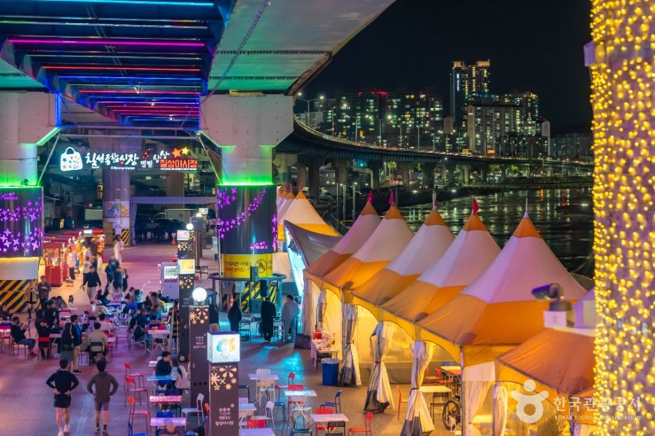 별별상상 칠성야시장은 1950년대부터 시작된 오랜 역사를 품은 칠성시장의 신천둔치에 2019년 11월 개장하였다. 먹거리 60종에 금요일에서 일요일은 프리마켓까지 즐길 수 있고, 요일별 색다른 공연 프로그램은 볼거리까지 만족시킨다. 신천을 품은 별빛야행 [별별상상 칠성야시장]에서는 신천둔치 야경과 함께 신천변에 별빛 소원 등 띄우기(유료), 공룡 포토존 등 다양한 이벤트도 체험해 볼 수 있다.