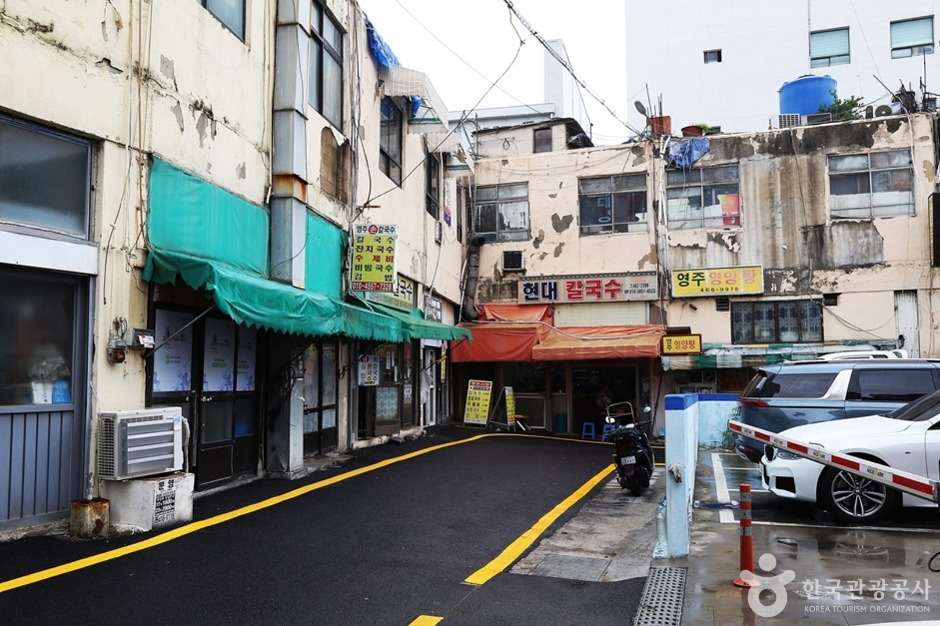 영주시장은 부산역 인근 영주고가 다리가 시작하는 지점에 있는 재래시장이다. 상가주택 건물형의 소형시장이며, 지금은 재래시장의 기능은 없어지고 칼국숫집으로 유명한 음식점들만 남아 있다. 영주시장을 처음 방문하면 이곳에 음식점이 있는 곳인가 하는 의아함이 느껴질 정도로 낡은 건물로 이루어져 있으나, 점심 무렵이 되면 줄 서서 기다려야 할 정도로 식객들이 많이 찾는 곳이다. 상가형 건물 내부 확 트인 공간 안에 옹기종기 모여있는 칼국수 집은 모두 다 오래된 전통 있는 맛집으로, 직접 면을 뽑아 칼국수를 만들어 준다. 주요 메뉴는 칼국수, 비빔 칼국수, 잔치국수, 김밥을 판매하며, 얼큰한 멸치육수에 탄력 있는 면발은 칼국수의 진미를 느끼게 해주는 맛집들이 있는 시장이다.