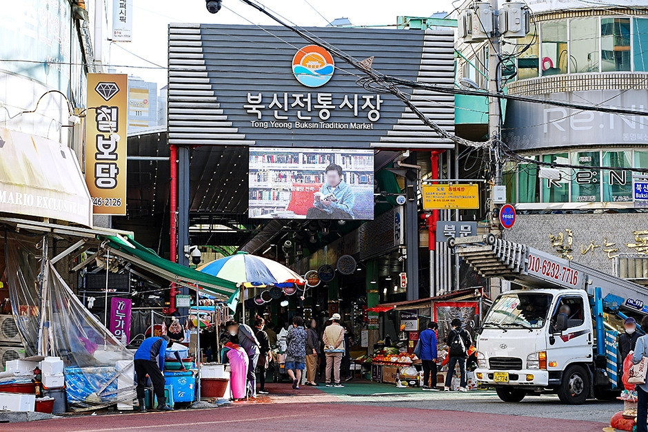 통영 북신 전통시장은 조선 시대 통영성의 관문이 있던 곳에 있어 관문 시장으로도 불리고 통영 현지인들에게는 거북 시장으로 더 친숙하게 불리는 곳이다. 여황산 정상에 우뚝 솟은 북포루의 기상을 안고 약 40여 년 전부터 상점이 생겨나기 시작해 통영 주민들과 함께 공존해 오고 있는 정겨운 시장이다. 통영의 대표 수산물과 농산물, 축산물 먹거리 등 다양한 상품을 취급하는 상점들이 줄지어 있으며, 낱개 포장된 건어물과 통영 기념품들도 팔고 있어 관광객들도 많이 찾는다. 최근에는 3층 규모의 공영 주차장이 세워져 주차 걱정 없이 편하게 쇼핑을 즐길 수 있다. 이밖에도 시장 내에는 회센터와 도다리쑥국 맛집, 곱창집 등 유명한 맛집들이 즐비해 시장 구경을 하며 통영의 별미들을 맛보기에도 좋다.