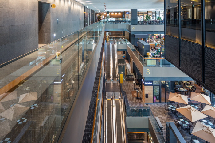 내부로 들어서면 직선으로 시원하게 뻗어 있는 에스컬레이터를 볼 수 있다. 1층부터 5층까지 연이어 오픈된 테라스 공간은 언덕을 오르는 듯한 재미를 주면서도 머무르는 동안 어반 라이프를 한껏 즐길 수 있는 여유와 편안함을 준다.